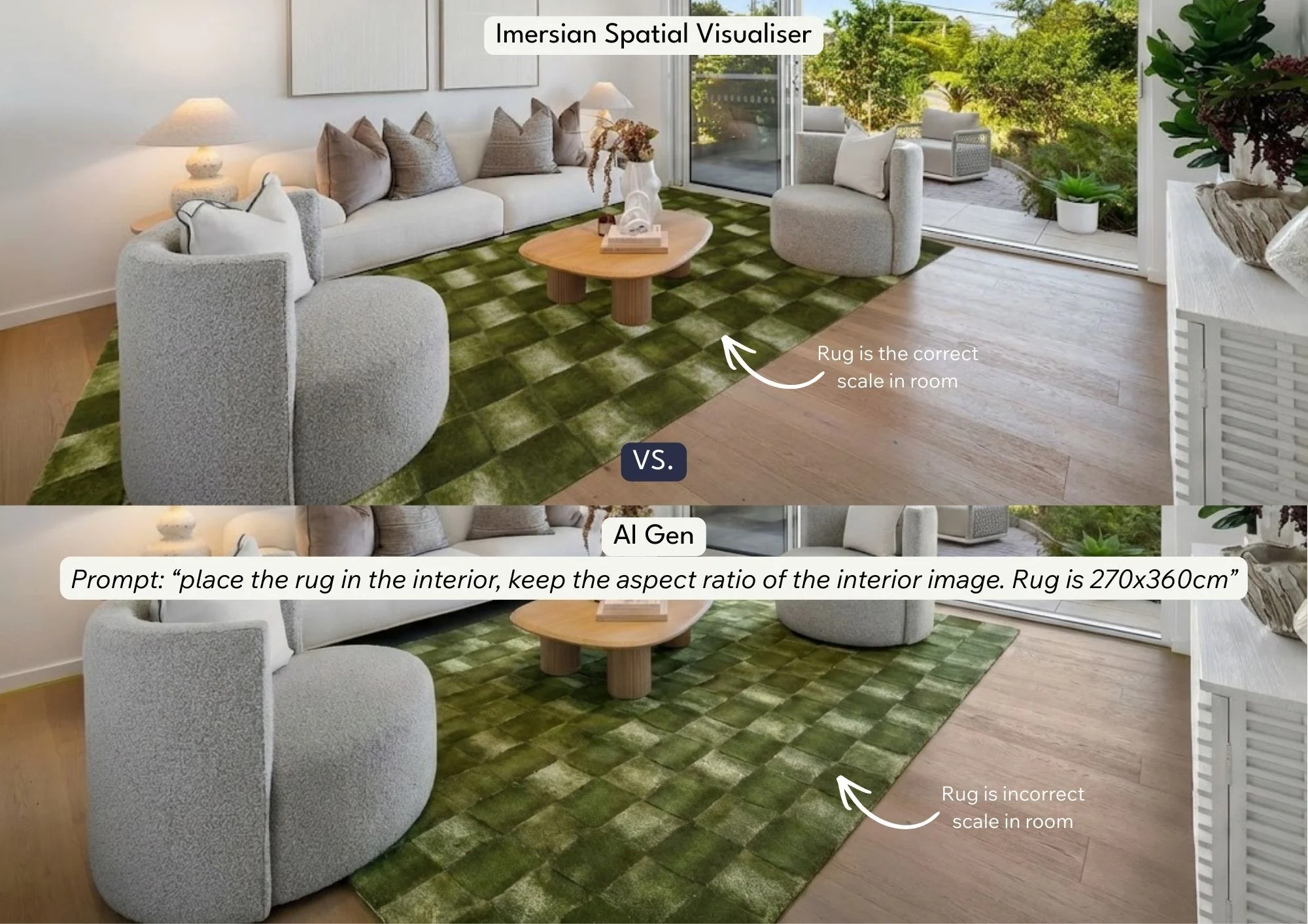 When you ask an AI to generate an interior scene, it doesn’t understand the dimensions of the room, the true size of the furniture, or the spatial relationships between objects. It simply generates an image that looks plausible.